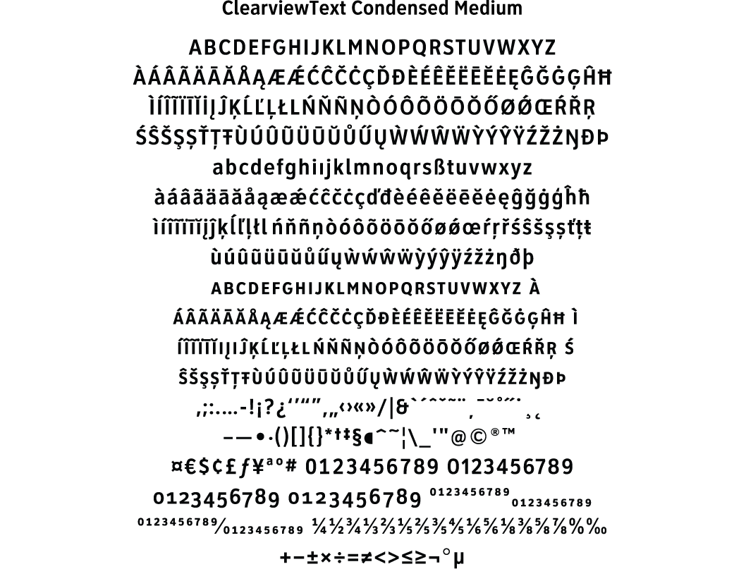 A modern sans neutral enough in design for corporate communication, with just enough of its own personality to separate itself from that vast ocean of sans serif fonts. ClearviewText represents the continuing evolution of the Clearview family of fonts. Its 48 fonts more than replaces the earlier ClearviewOne family of 156 PostScript fonts. Along with cross-platform capability, every member of the family now contains small caps, oldstyle and lining figures in both proportional and tabular widths, arbitrary fractions, inferior and superior figures, and extended latin diacritical support. Drawing on the same research and development that led to the ultra-legible ClearviewHwy fonts ClearviewText functions as a highly readable series of text and display fonts. John Berry writing about its predecessor ClearviewOne in Creative Pro says it “… reads astonishingly well as a text face.”