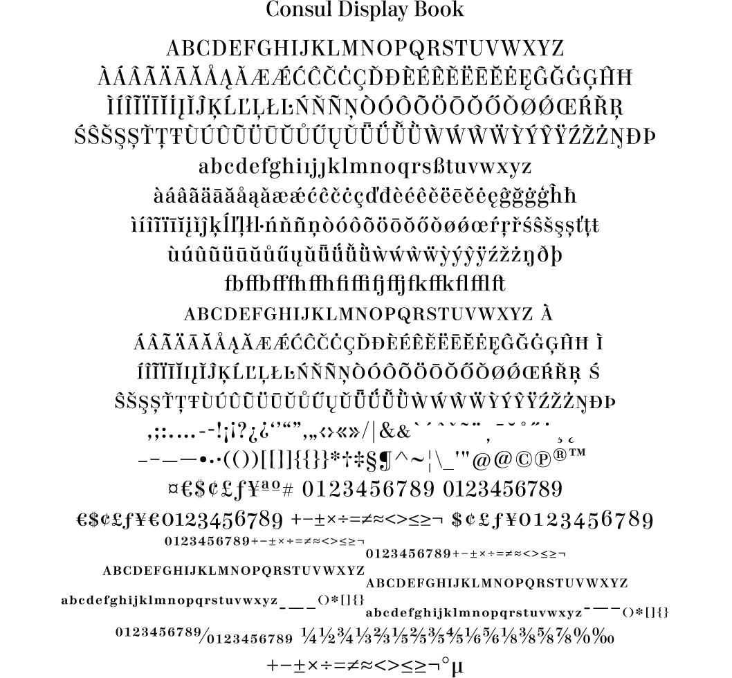 The upright forms borrow heavily from italic shapes giving the roman a sense of motion. Alternate versions of the a, e, g, r and s give design many different personalities. Again I’ve included support for Vietnamese and there are lots of the OpenType features that are becoming standard for the fonts that I design.