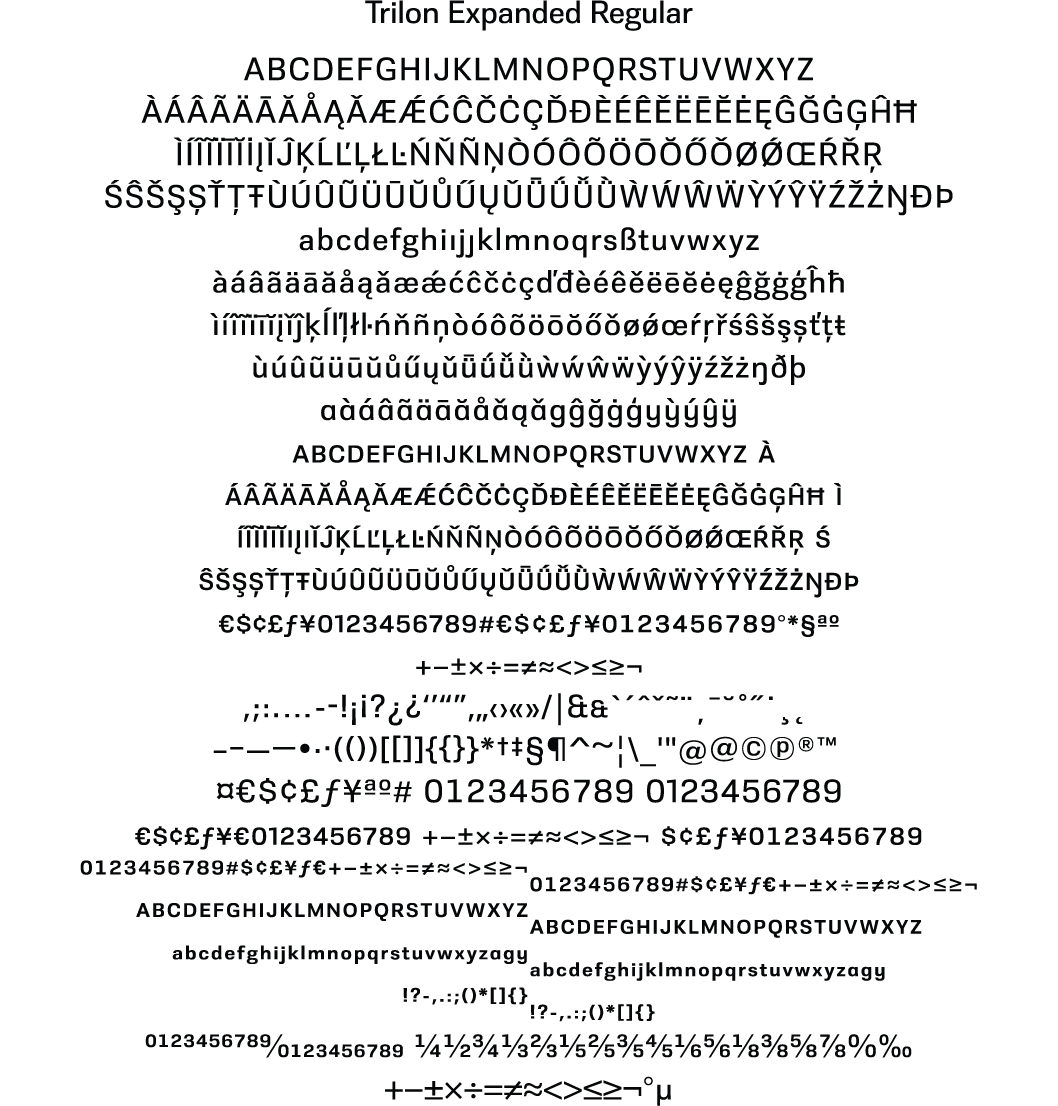 I call it Trilon because I have built at least three different personalities into the design by way of OpenType Stylistic Sets. Set 1 changes the lowercase g from the double bowl design to a simpler single bowl style. Set 2 changes the lowercase a from its default two-story design into a one-story design. Set 3 changes the lowercase y from the diagonal v style to an upright u style. Set four changes all of these with one command. (Great for applying to the oblique versions to give them a more distinct personality).